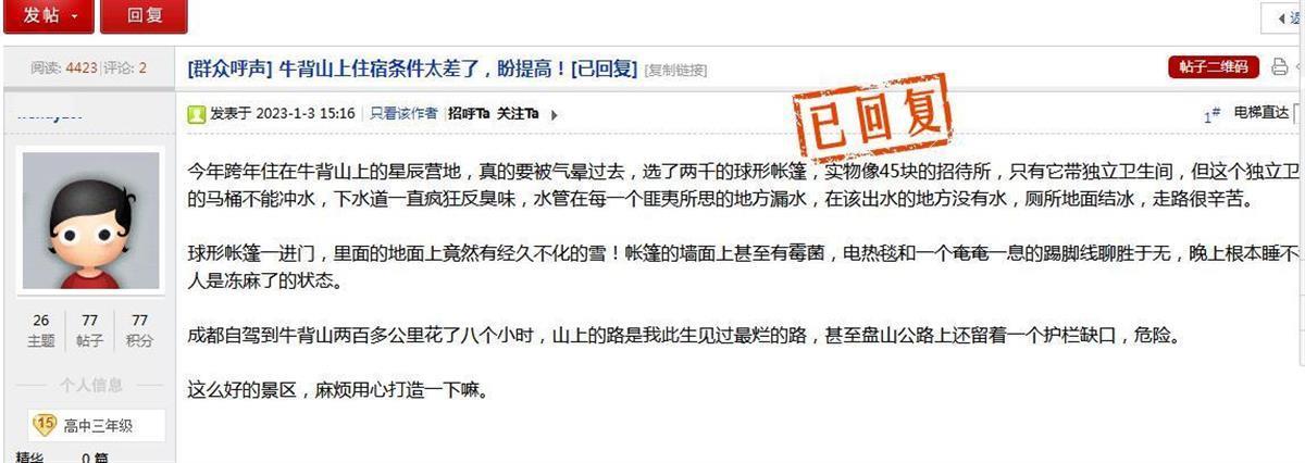近日,一位网友吐槽称四川雅安荥经县牛背山景区“2000元帐篷房像45元招待所”。1月17日,荥经县文化体育和旅游局回复称,景区已取得游客谅解,并要求景区举一反三整改,进一步提升服务质量。